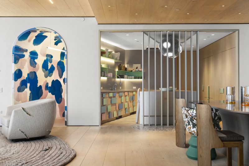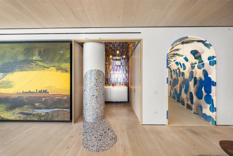 From the moment you enter, the home’s design reveals an almost cinematic level of detail: a polka-dot resin tunnel that feels like walking through an art installation, stained-glass–inspired panels that bend sunlight into jewel tones, and sculptural rooms that flow seamlessly into one another.