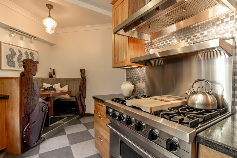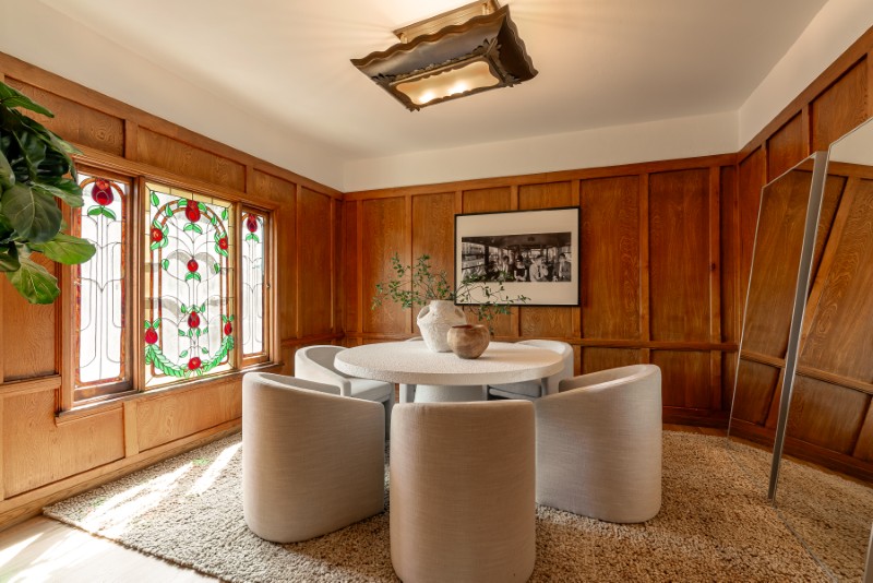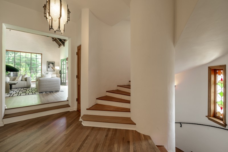 Grolle, known for his work during Hollywood’s architectural boom of the 1920s, imbued the home with Old World craftsmanship: spiral staircases, stained-glass windows, arched doorways, and refinished hardwood floors that have all been lovingly maintained.
