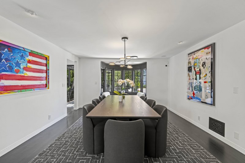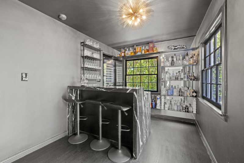A formal living room with a statement fireplace anchors the main floor, while the dining room and full wet bar expand the home’s entertaining potential. These spaces highlight the house’s original floor plan, modernized for today’s lifestyles.