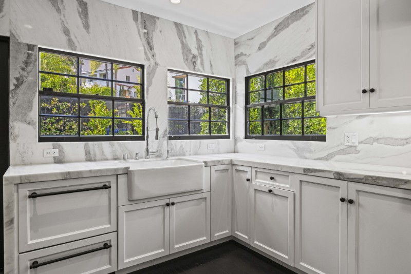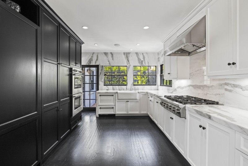 The kitchen is equipped with marble countertops, custom cabinetry, and high-end appliances. Designed for both everyday use and dinner parties, it maintains a timeless elegance in line with the rest of the home.