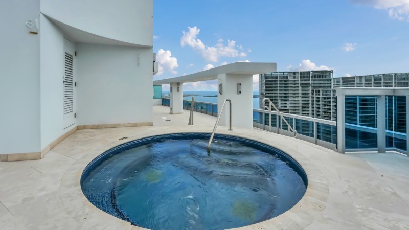 The standout feature is the private rooftop terrace, which adds more than 2,000 square feet of outdoor space. A built-in Jacuzzi overlooks Biscayne Bay, the Miami River, and the downtown skyline, making this a prime spot for entertaining or soaking in the city lights.