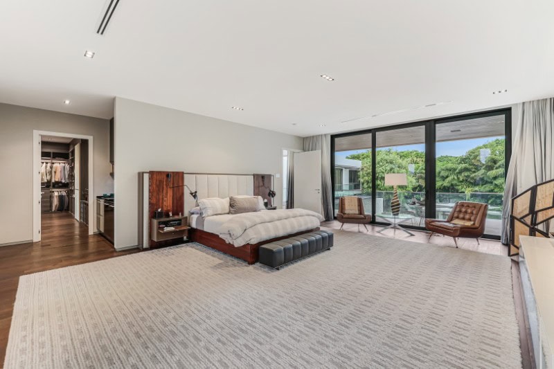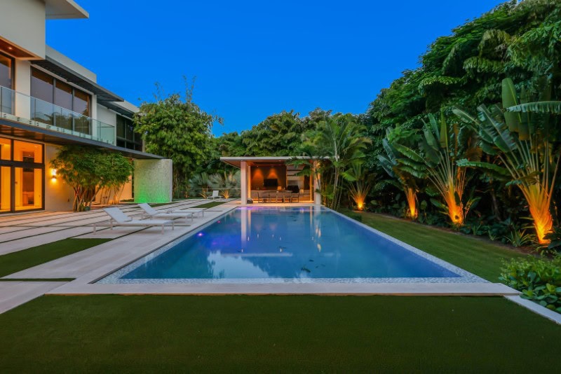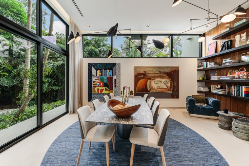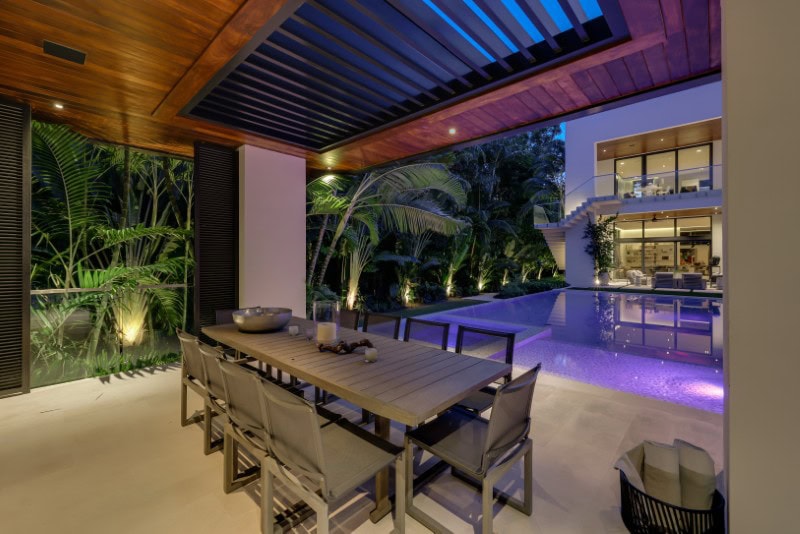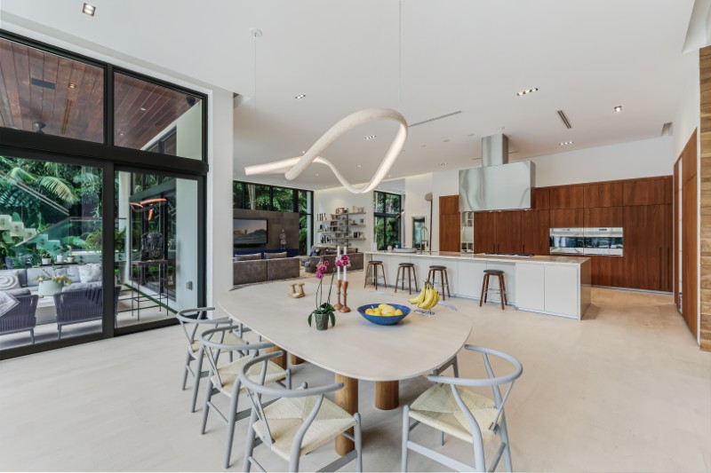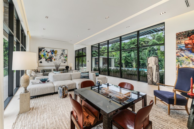 Throughout the interiors, Cordovez’s architectural vision is expressed through wood paneling, limestone floors, and high ceilings that emphasize light and volume. With smart home automation and expansive windows framing views of the lush tropical landscaping, a wall of glass opens to the backyard’s resort-style amenities.